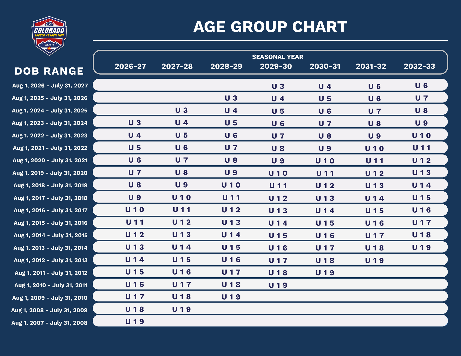 - Cada equipo competitivo se ubica en las divisiones de la liga de la Asociación de Fútbol de Colorado (CSA) según su nivel de plantilla y su habilidad.
